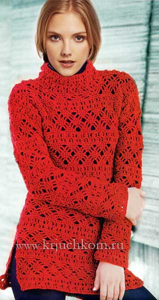 Для вязания женского пуловера крючком потребуется: 500 г тонкой пряжи красного цвета, крючок № 4,5.